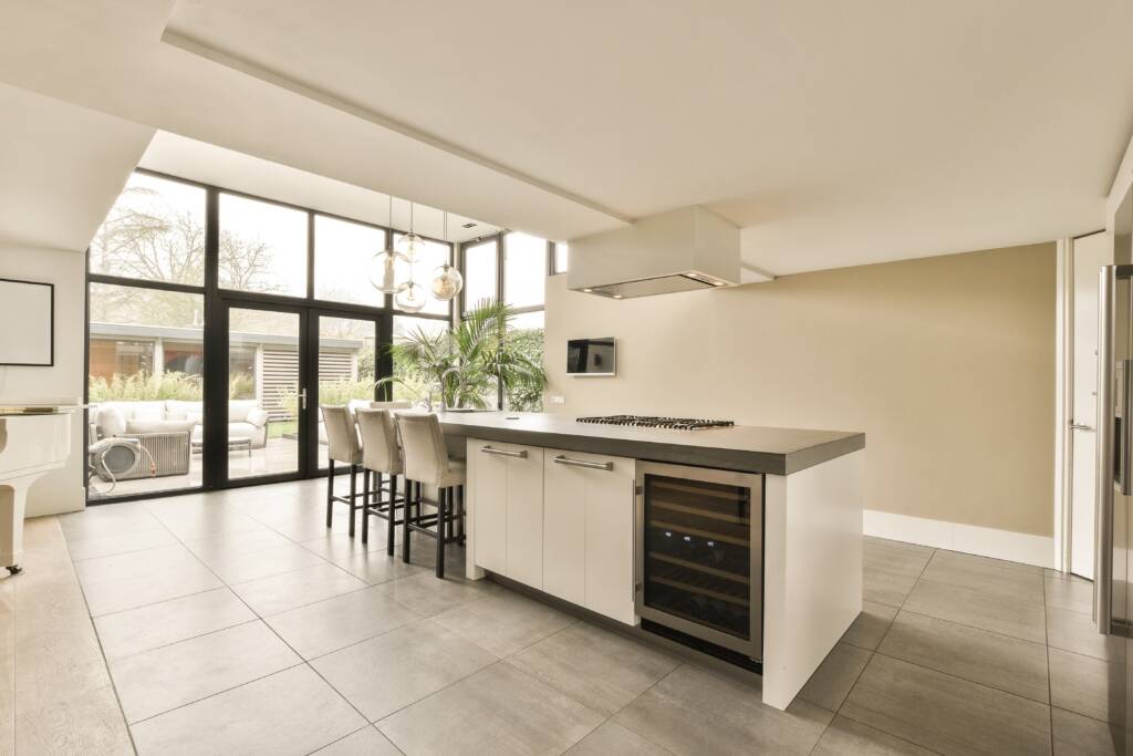 Tezgâh malzemesinde kuvars kompozit, granit veya ısıya dayanıklı kompakt laminat gibi alternatifler değerlendirilir; birleşim–damlalık–pah detayları leke tutmayı azaltacak şekilde tasarlanır. Zemin geçişlerinde su sıçramasına dayanıklı derz–silikon kullanılır.